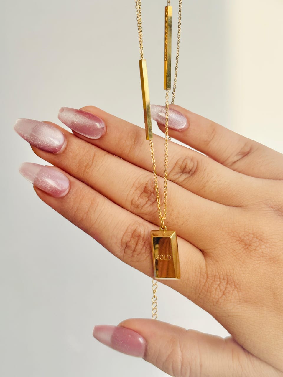 Unique Pendant Design: Features a gold bar-shaped pendant engraved with the word “GOLD,” giving it a modern and luxurious aesthetic.