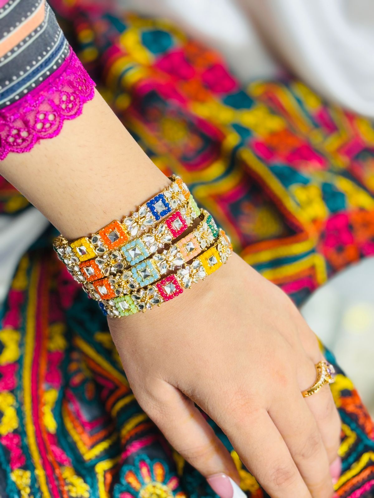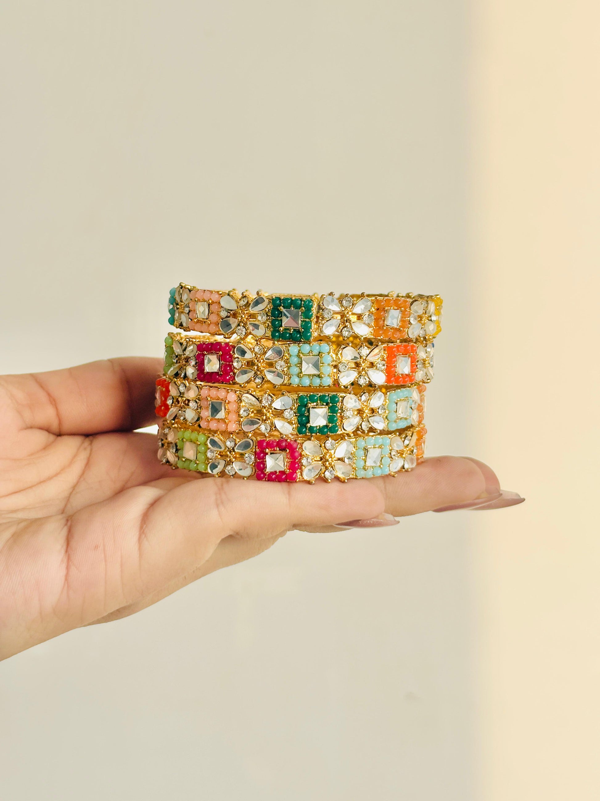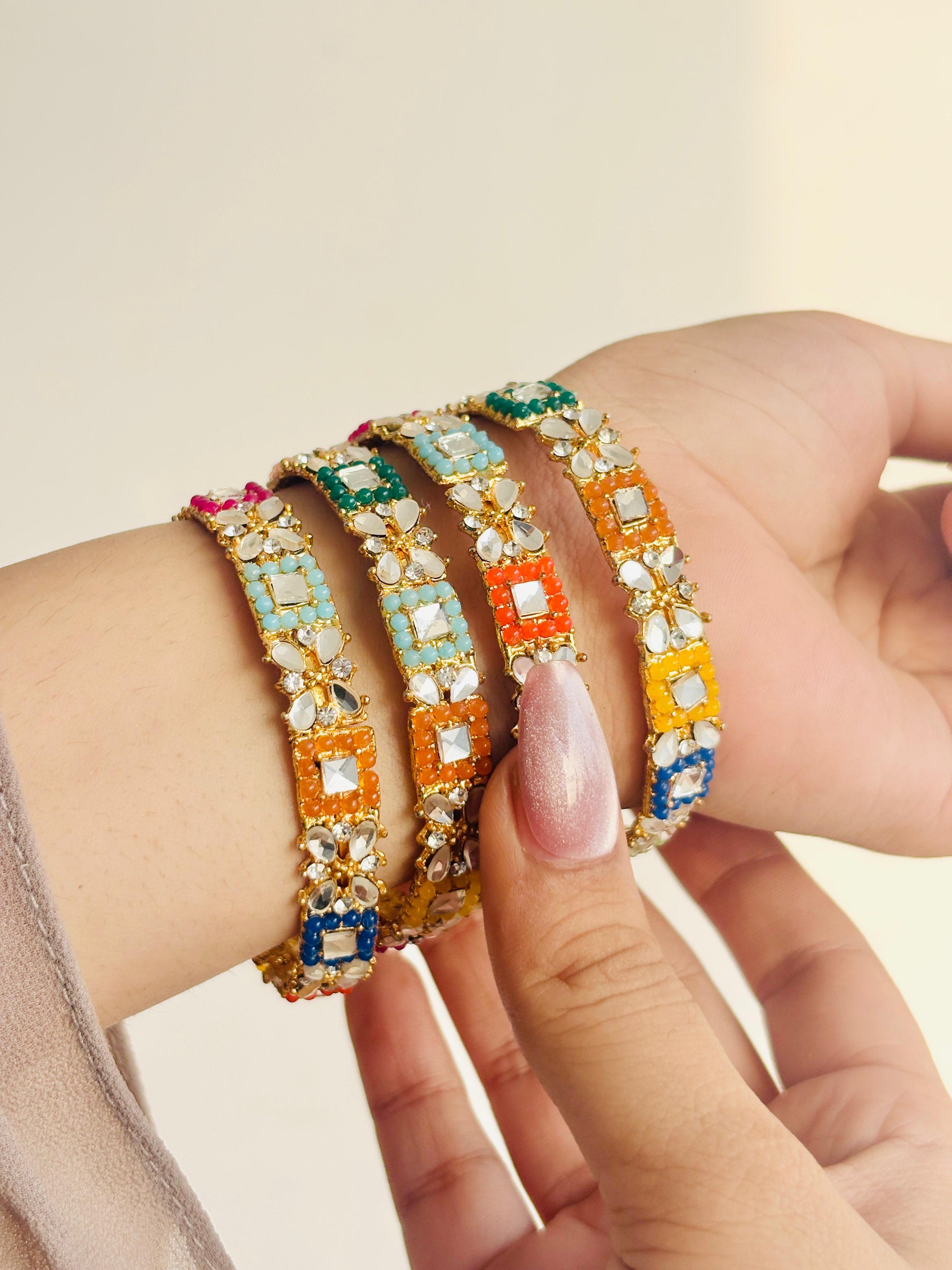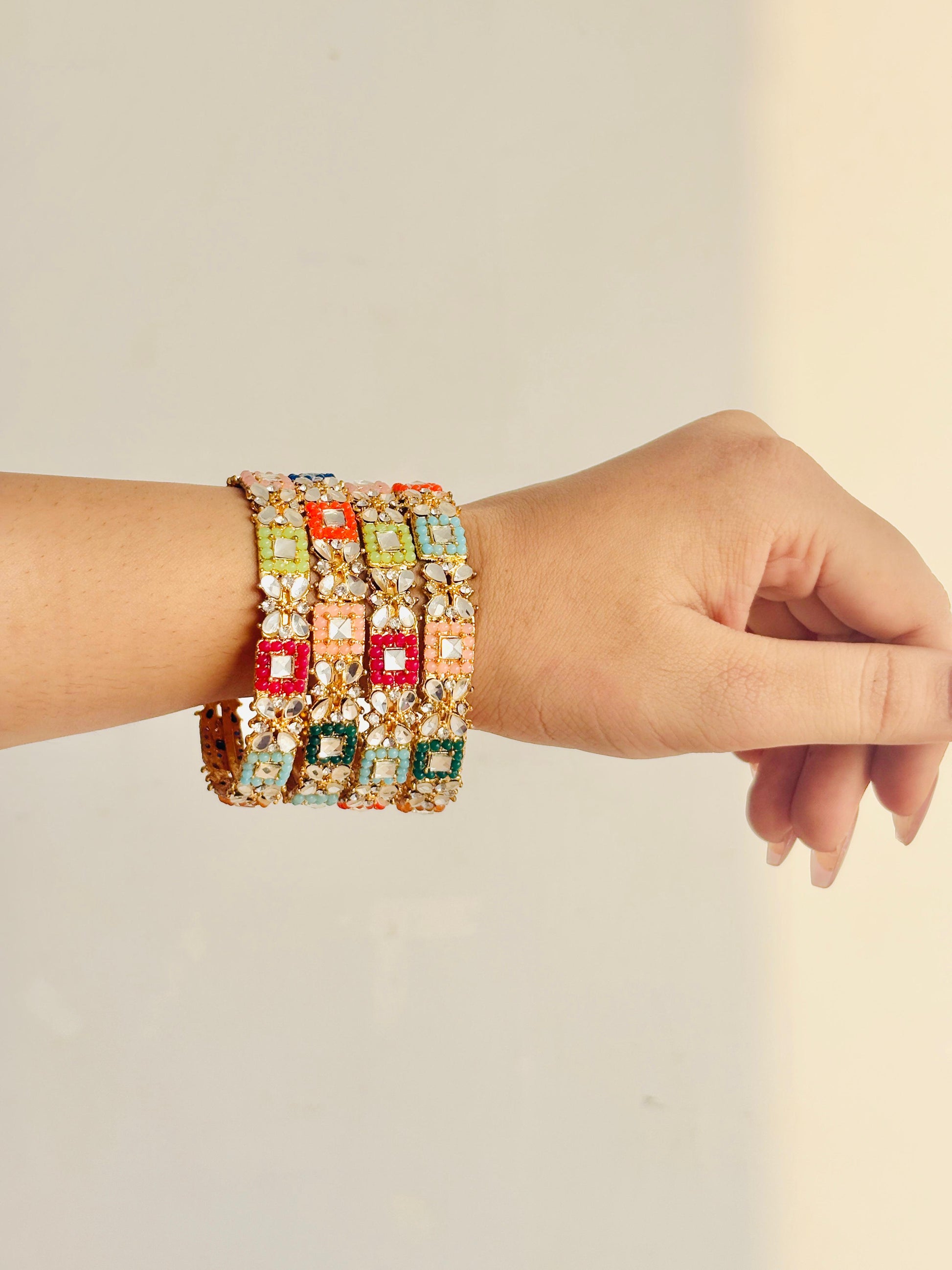 Beautiful multi-colour mirror work kangan set crafted to add a bright festive touch to any outfit.