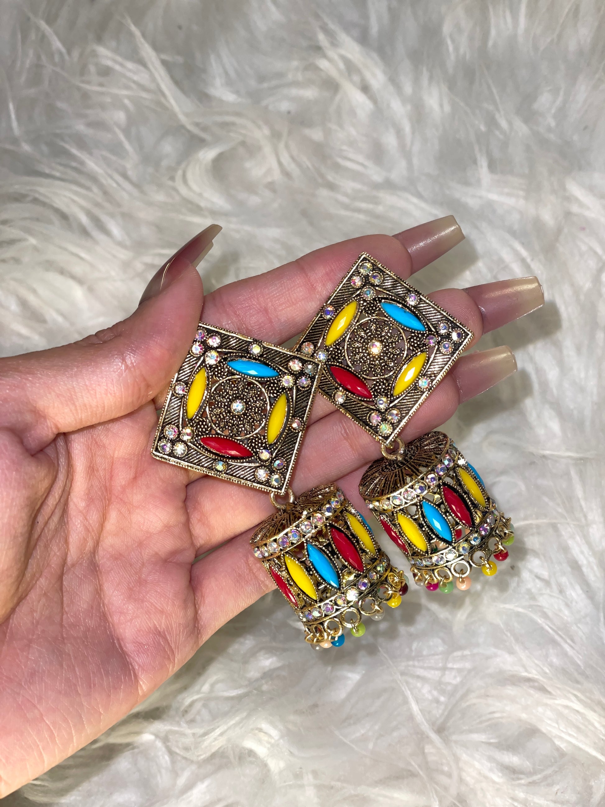 Elegant Traditional Design – Features a square antique-finish stud paired with intricately crafted jhumka drops for a rich ethnic look.
